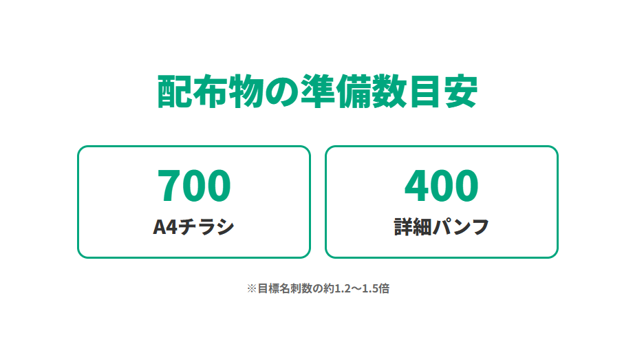 目安として、3日間の展示会で300〜500件の名刺交換を目標にする場合、A4チラシは500〜700枚、詳細パンフレットは300〜400部程度準備する企業が多いです。ただし、展示会の規模や自社ブースの立地によって必要数は変わりますので、一般的には少し多めに準備しておくと安心です。