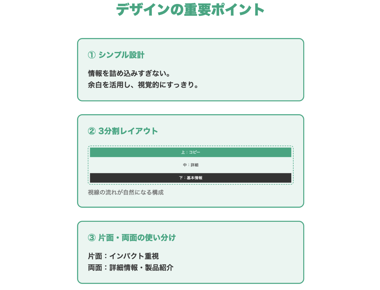 一方、製品の詳細や複数のサービスを紹介したい場合は、両面を活用することで情報を整理して掲載できます。また、折り加工を施したリーフレット形式にすることで、コンパクトに持ち運びやすく、情報量も増やすことができます。