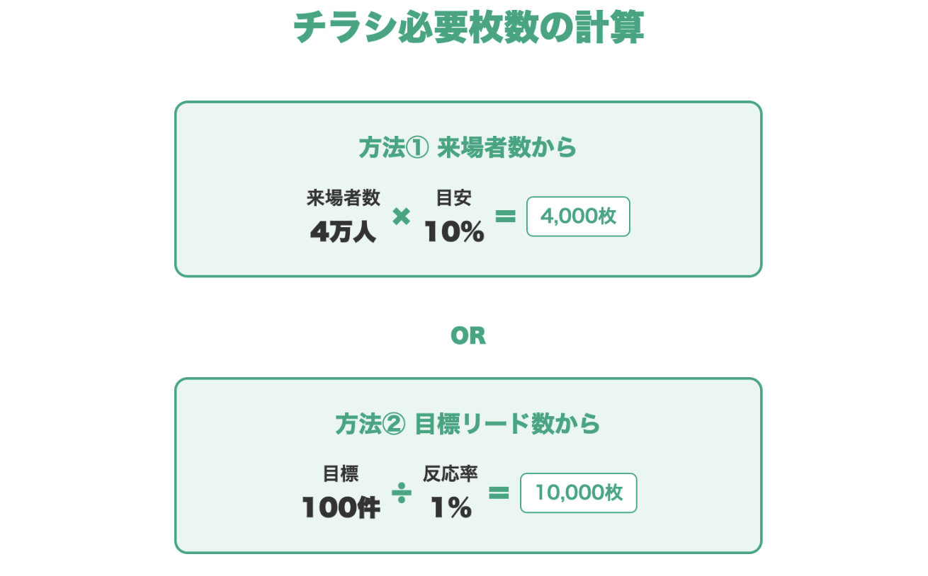 このように、「何件の反響が欲しいか」を先に決めてから必要枚数を割り出すと、無駄のない準備ができます。なお、参考として新聞折込チラシやポスティングなどの一般的な販促チラシの反響率は0.01%~0.3%程度とされていますが、展示会での配布は来場者が既に興味を持っている層であるため、一般的なポスティングよりも高い反応率が期待できます。