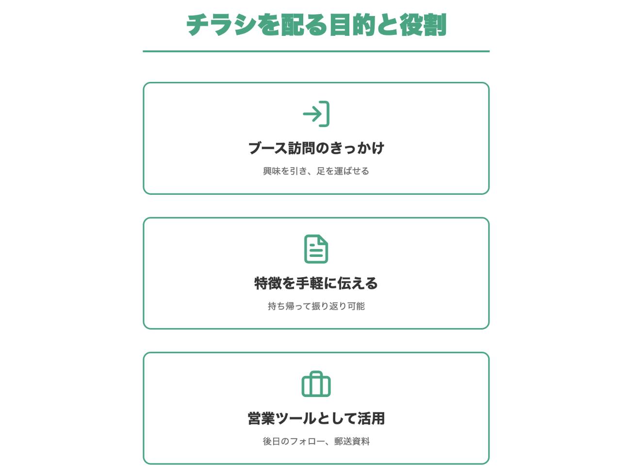 つまり、チラシは展示会の「その場限り」のツールではなく、継続的な営業活動をサポートする資料として機能します。