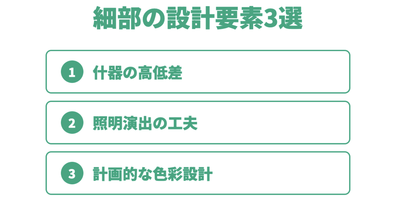 レイアウトの大枠が決まったら、細部の設計要素にも目を向けることで、さらに魅力的なブースを作れます。なぜなら、什器の配置、照明、色彩といった細かな要素が、ブース全体の印象や商品の見え方を大きく左右するからです。