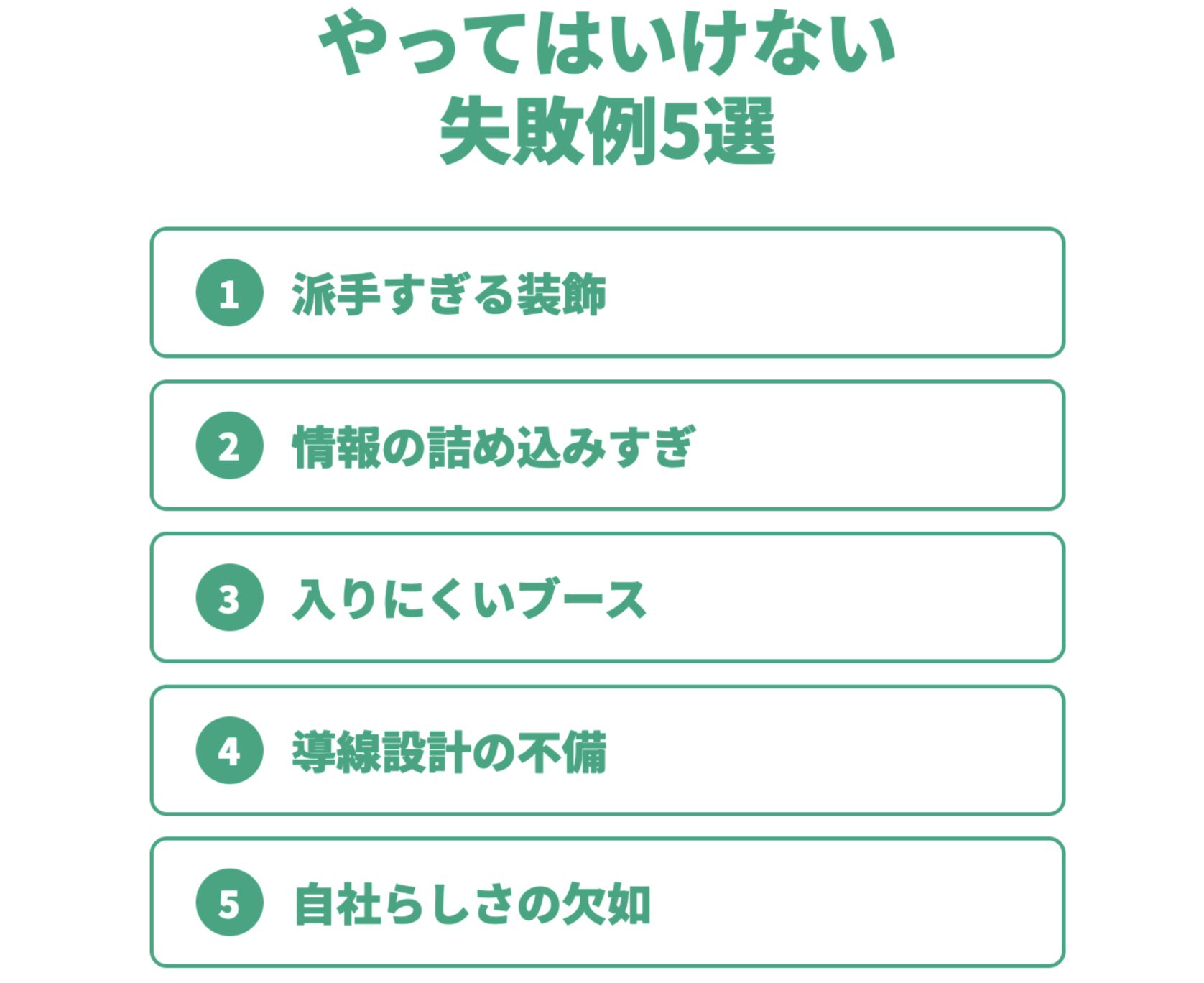 ここでは、実際の展示会でよく見られる5つの失敗例と、その対策について解説します。これらを意識することで、来場者にとって魅力的なブースを作ることができるでしょう。