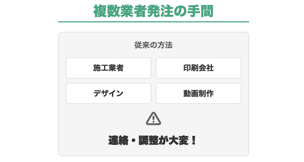 展示会準備では、ブース施工業者、印刷会社、デザイン会社、動画制作会社など、複数の業者への発注が必要になることが一般的です。しかし、それぞれの業者と個別にやり取りをすると、連絡の手間が増え、スケジュール調整だけでも多くの時間を費やしてしまいます。