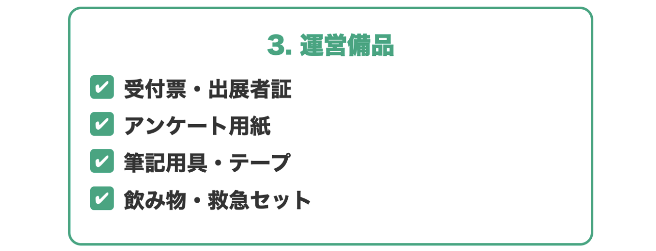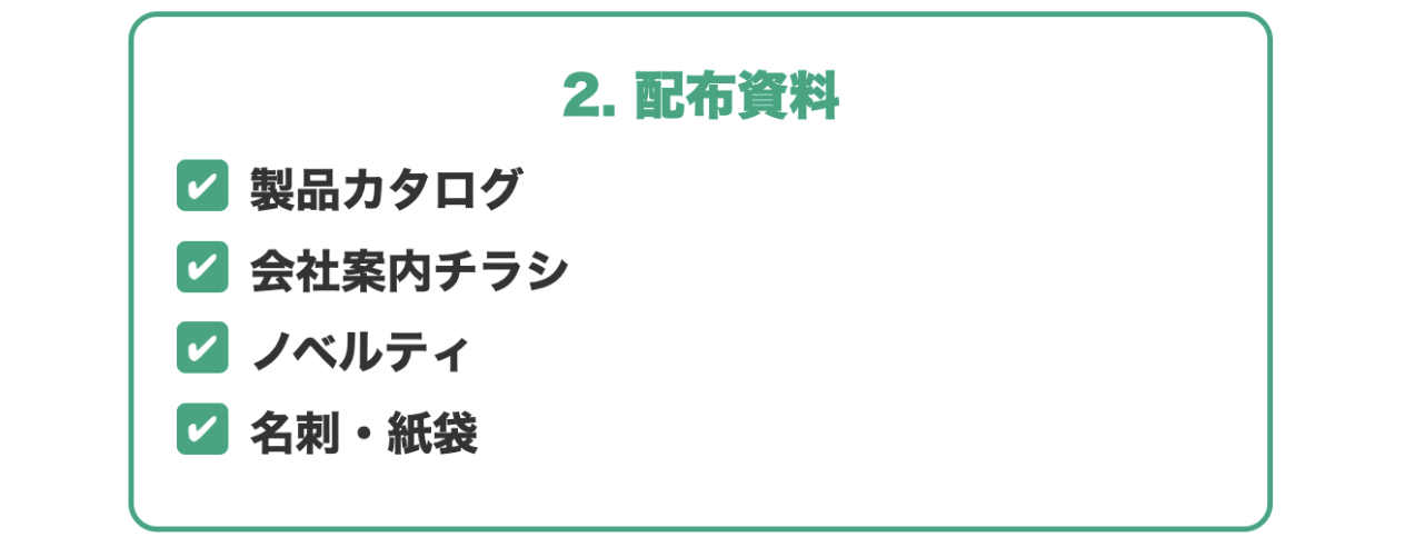 当日に慌てないよう、展示会の1週間前にはチェックリストを作成し、備品の点検を済ませておくことをおすすめします。