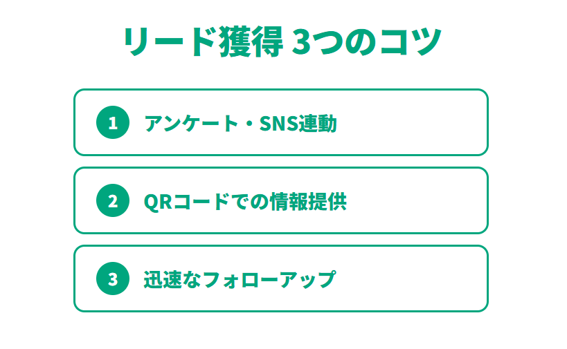 サンプルを配るだけでなく、リード情報を獲得し、展示会後の商談につなげる仕組みを作ることが重要です。展示会の来場者に対するリード獲得率は、一般的におよそ5〜10%とされています。ここでは、その確率を高めるための具体的な方法をご紹介します。​