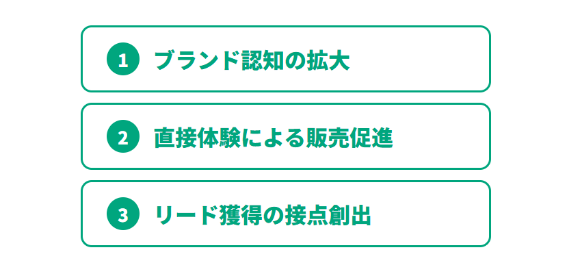 さらに、サンプル配布をきっかけに来場者との接点が生まれ、名刺交換やアンケート回答などリード獲得のチャンスが広がります。このように、サンプリングは認知・販促・リード獲得という3つの側面で効果を発揮する施策なのです。​