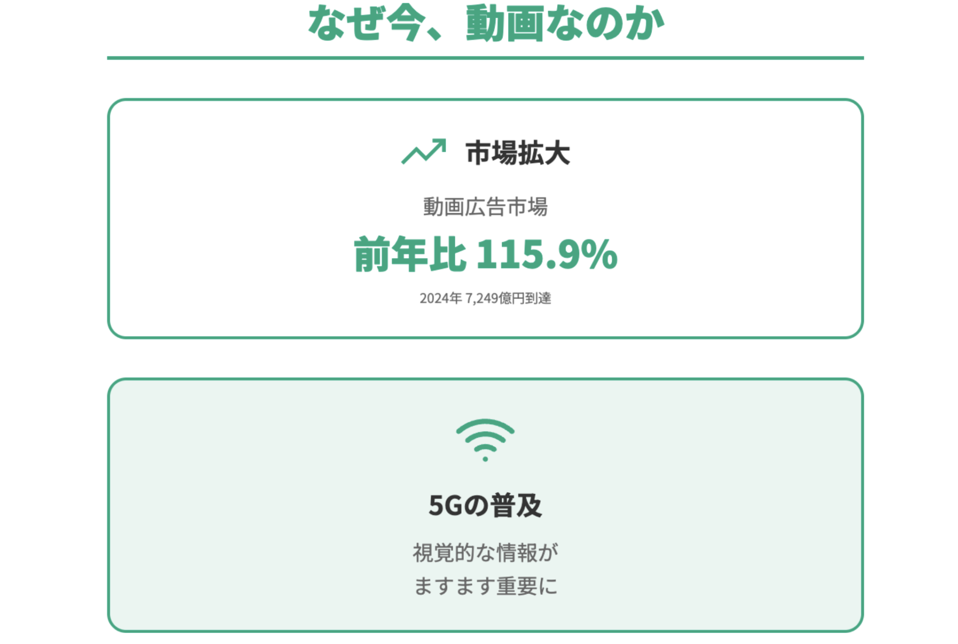 近年、動画コンテンツの市場は急速に拡大しており、2024年の動画広告市場は前年比115.9%の7,249億円に達し、2028年には1兆円を超える見込みです。 この背景には、5Gの普及によるモバイル通信の高速化があり、視覚的な情報がますます重視されるようになっています。