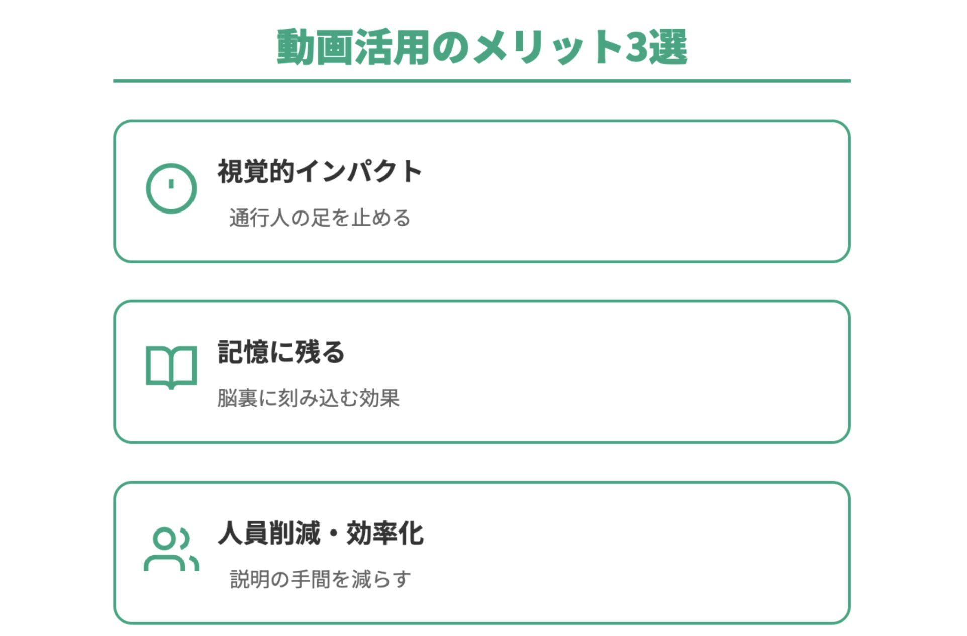 動画を活用することで、営業スタッフが口頭で説明する手間を減らし、より多くの来場者に対応できるようになります。 また、視覚と聴覚の両方に訴える動画は、文字情報に比べて記憶に残りやすいという特徴があります。