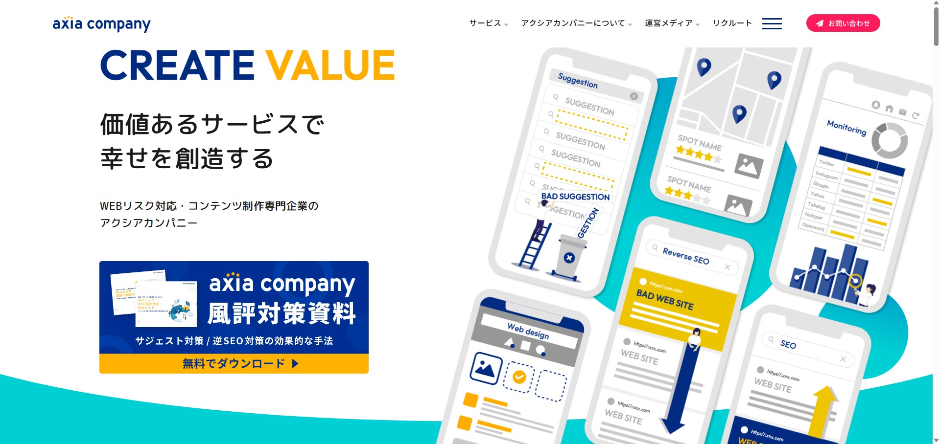 “アクシアカンパニーは、逆SEO対策やサジェスト対策に強みを持つ風評被害対策の専門企業です。 東京都豊島区を拠点に、検索結果上のネガテhttps://jobjob-appeal.com/ィブ情報を押し下げることで、企業の評判やブランド価値の保護を支援しています。”